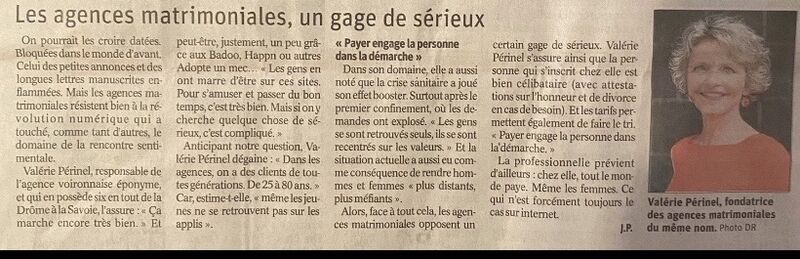 On pourrait les croire datées. Bloquées dans le monde d'avant. Celui des petites annonces et des longues lettres manuscrites enflammées. Mais les agences matrimoniales résistent bien à la révolution numérique qui a touché, comme tant d'autres, le domaine de la rencontre sentimentale. Valérie Périnel, responsable de l'agence voironnaise éponyme, et qui en possède six en tout de la Drôme à la Savoie, l'assure : "ça marche encore très bien" Et peut-être, justement un peu grâce à Badoo, Happn ou autres Adopte un mec..."Les gens en on marre d'être sur ces sites. Pour s'amuser et passer du bon temps, c'est très bien. Mais si on y cherche quelque chose de sérieux, c'est compliqué". Anticipant notre question, Valérie Périnel dégaine : "Dans les agences, on a des clients de toutes générations. De 25 à 80 ans" Car estime-t-elle, "même les jeunes ne se retrouvent pas sur les applis". "Payer engage la personne dans la démarche" Dans son domaine, elle a aussi noté que la crise sanitaire a joué son effet booster. Surtout après le premier confinement où les demandes ont explosé. "Les gens se sont retrouvés seuls, ils se sont rencontrés sur les valeurs" Et la situation actuelle a aussi eu comme conséquence de rendre hommes et femmes "plus distants, plus méfiants". Alors, face a tout cela, les agences matrimoniales opposent un certain gage de sérieux. Valérie Périnel s'assure ainsi que la personne qui s'inscrit chez elle est bien célibataire (avec attestation sur l'honneur et de divorce en cas de besoin). Et les tarifs permettent également de faire le tri. "Payer engage la personne dans la démarche". La professionnel prévient d'ailleurs : chez elle, tout le monde paye. Même les femmes. Ce qui n'est pas forcément toujours le cas sur internet.